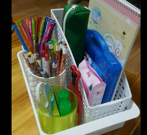 사물함 안을 쓰레기장으로 만들어버리는 어린이들에겐 사물함 정리용 바구니가 필요합니다. 사물함 안에 쏙 들어갈 정도의 바구니를 학기 초 준비물과 함께 보내면 사물함 정리가 훨씬 수월합니다. 다이소에 가면 쉽게 구할 수 있습니다.